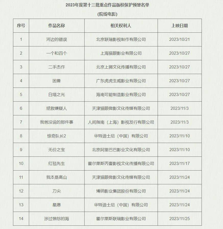 日前,国家版权局公布2023年度第十三批重点作品版权保护预警名单(院线电影),包含《河边的错误》《一个和四个》《二手杰作》《困兽》《白塔之光》《拯救嫌疑人》《我爸没说的那件事》《惊奇队长2》《无价之宝》《红毯先生》《我本是高山》《刀尖》《星愿》《涉过愤怒的海》共14部影片。