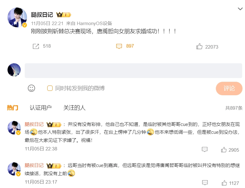 唐禹哲总决赛现场求婚的消息迅速在网上传播发酵,许多网友纷纷送上祝福,也有另一种声音对他的这个行为产生质疑。有网友评论说这是赶鸭子上架吗?是某台为了流量精心策划的吧?是唐禹哲为了抢占总决赛的出道席位吧?